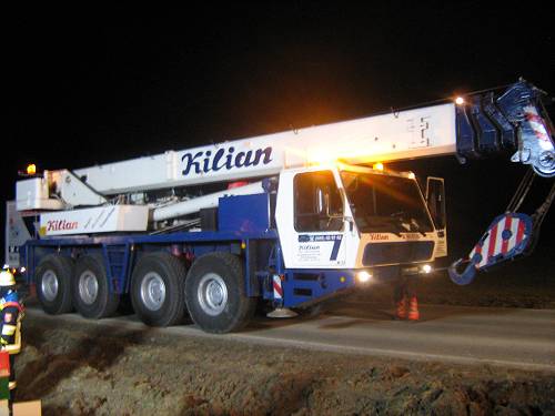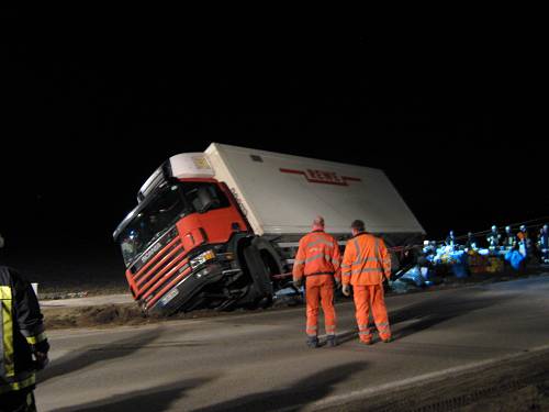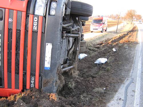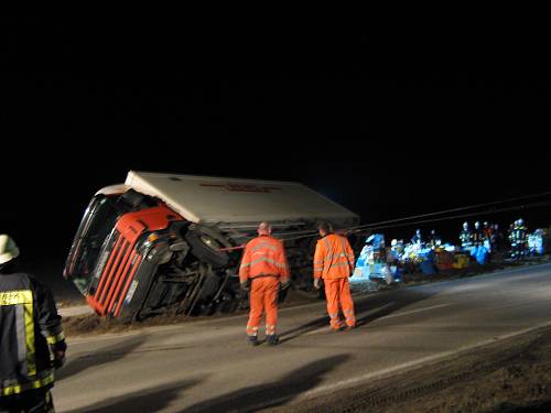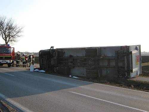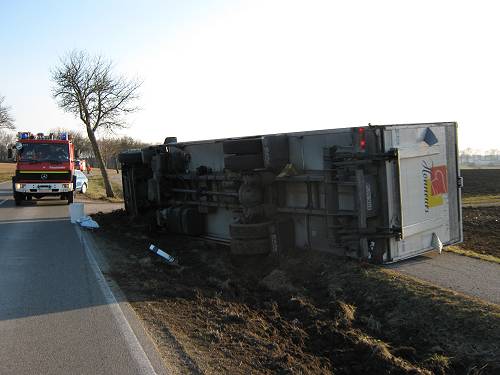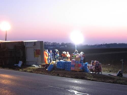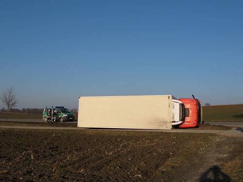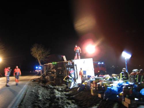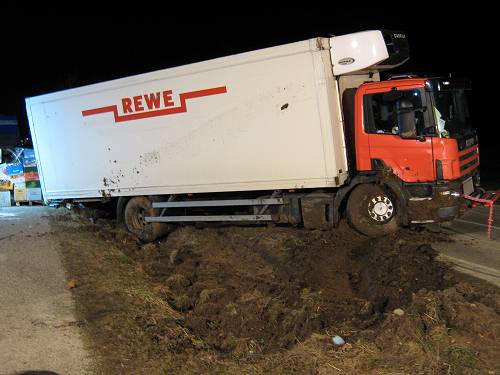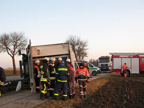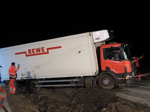 an die Einsatzstelle. Anschließend konnte der LKW wieder aufgerichtet werden.