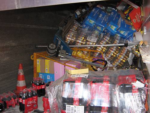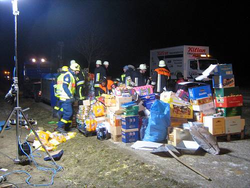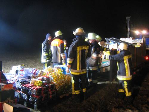 Bevor der LKW geborgen werden konnte musste in Handarbeit die Ladung entladen