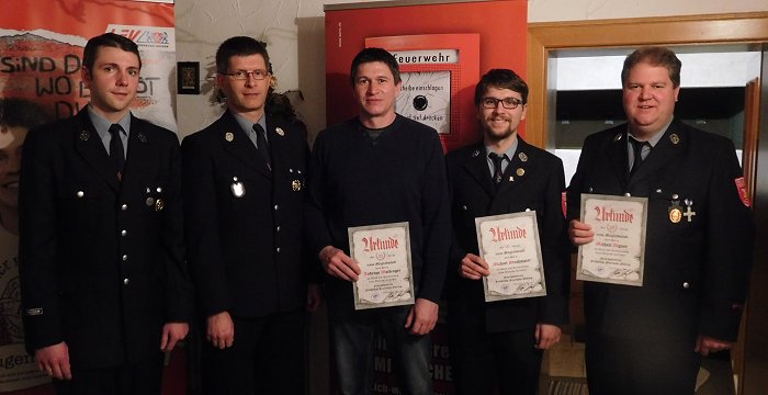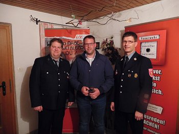 (von links) Vorstand Stefan Hofmann, 2. Kdt. Guido Mann, 25 Jahre aktiver Dienst Andreas Lobermeier